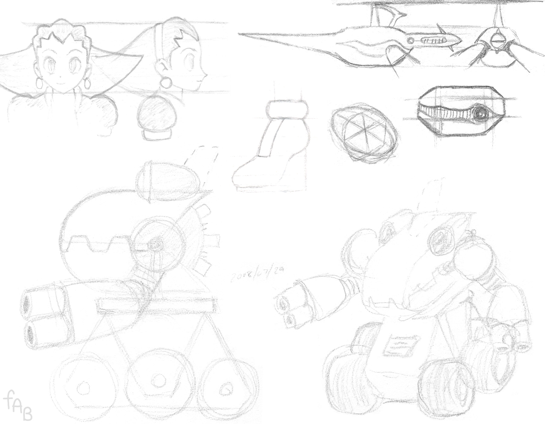These sketches were done for my 3D comic, Alternate Trigger. The Kroschädil is an original mech used by Teisel. My 3D art program of those days could be very difficult to get good results in. The Tron and Geetz sketches helped me to visualize how best to approach forming these shapes in 3D, and were probably done a little before and after the date shown, respectively.