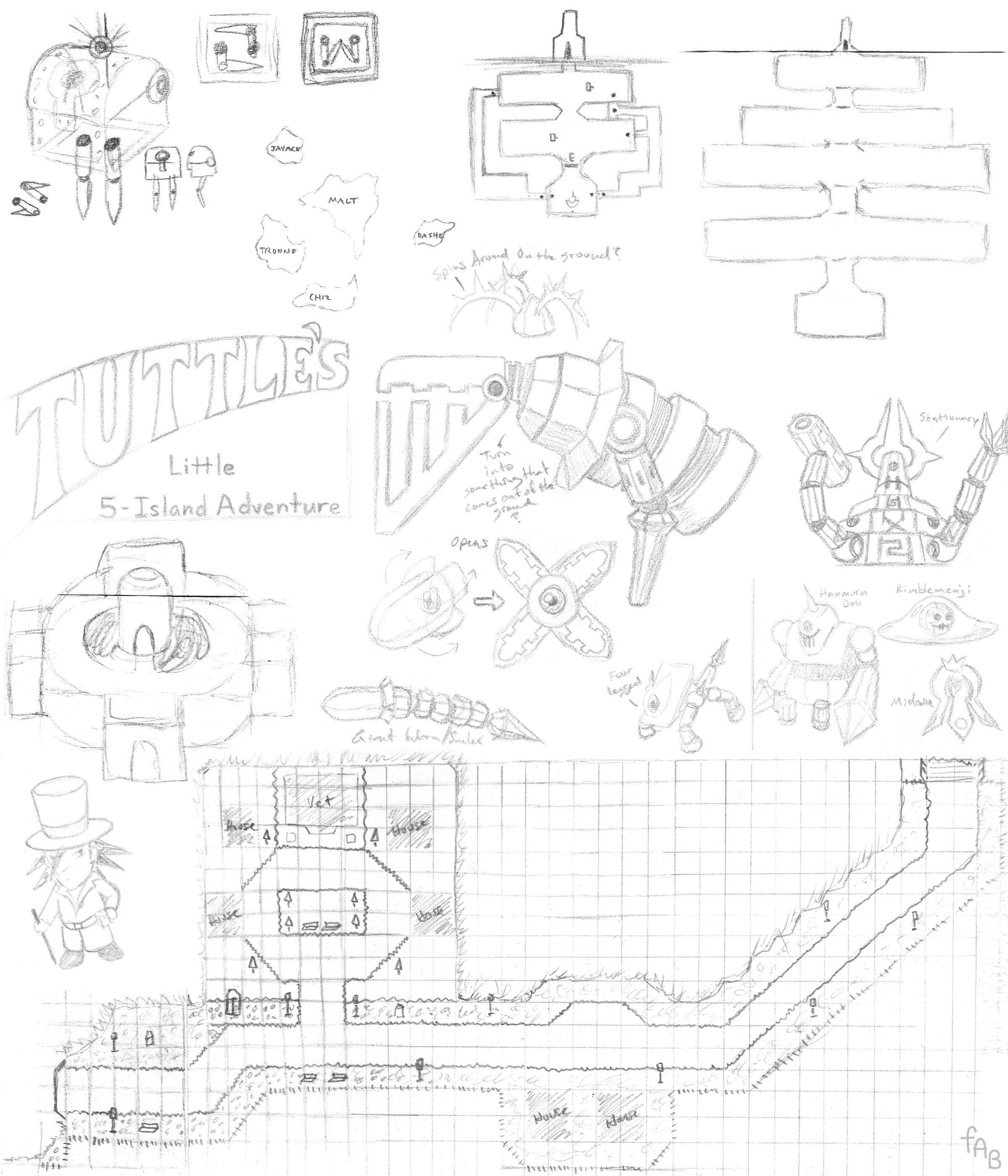 Collected sketches from three fan games I worked on, Foo-roo's Flight, Trapped Box Rebellion, and Tuttle's Little 5-Island Adventure. Most of them were for TL5IA, including trying to figure out what sort of reaverbot bosses would work well in a top-down, short attack range game. My best guess for all of these is circa 2009, though they may have been anywhere from 2008-2011.
