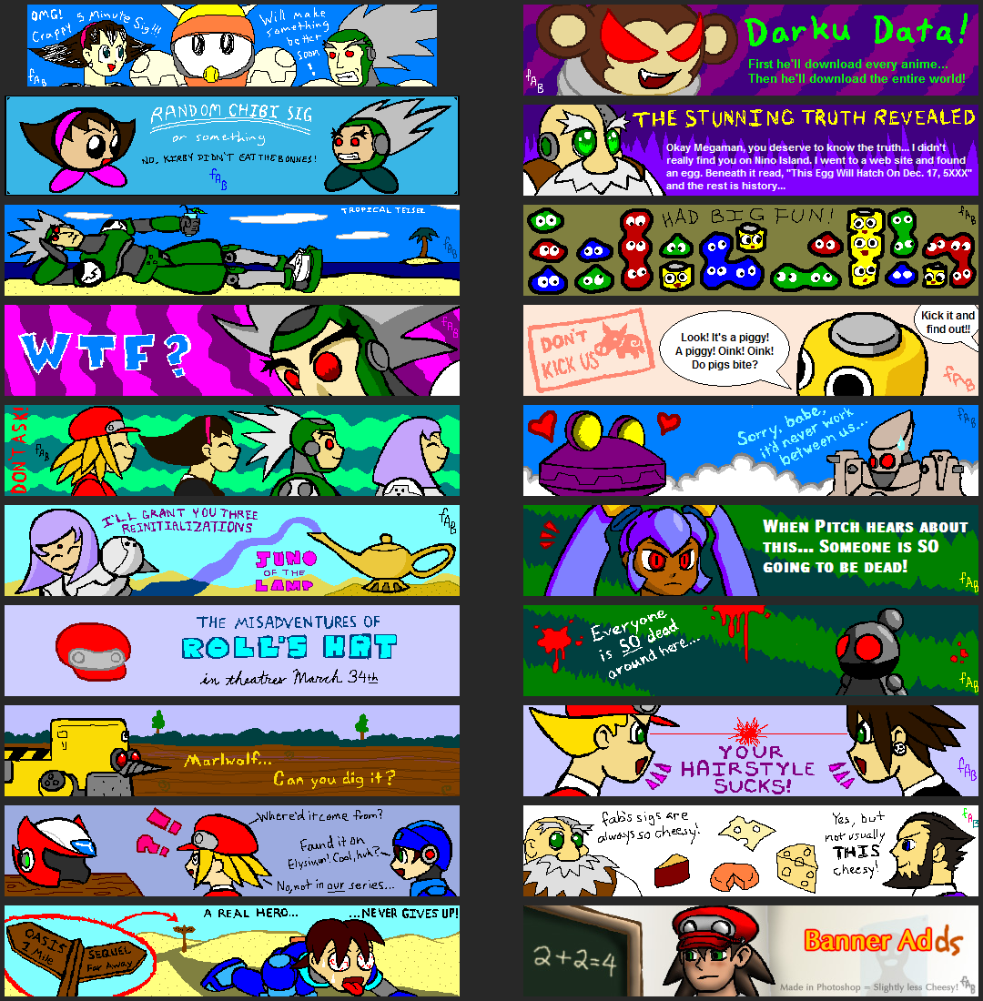 Back in the early days of the Mega Man Legends Station Forums, I whipped up a crappy little MS Paint banner for my signature. Then I did another, then others, usually just drawn at random while waiting to wrap up judging back when we had an ongoing caption contest. The forum members kind of got into them and it became an ongoing thing, until the next thing I knew there were 40 of them. This batch covers the first half, 1-10 going downward on the left, and 11-20 going down the right. The first was done 2005/09/02, and the twentieth 2006/07/10. See here for the next batch.