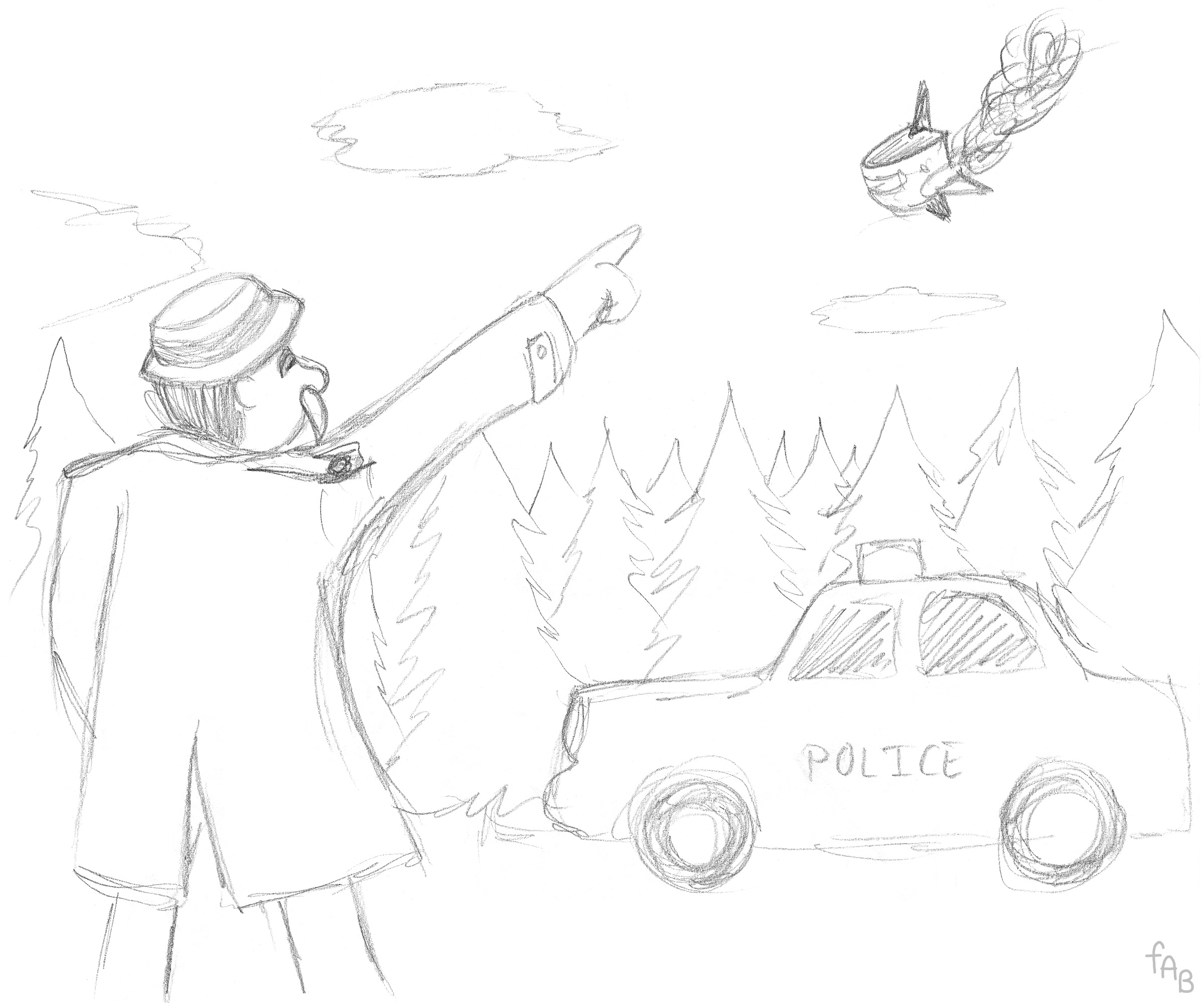 Once upon a time there was an MMLS art contest. The idea was for people to take a familiar scene from one of the games and show it in a different way to make it a fresh take. My example idea was the scene of the Flutter crash landing on Kattelox, but drawn from the Inspector's perspective as he watches it from a distance. I liked the example idea enough that I later sketched it myself for the fun of it.