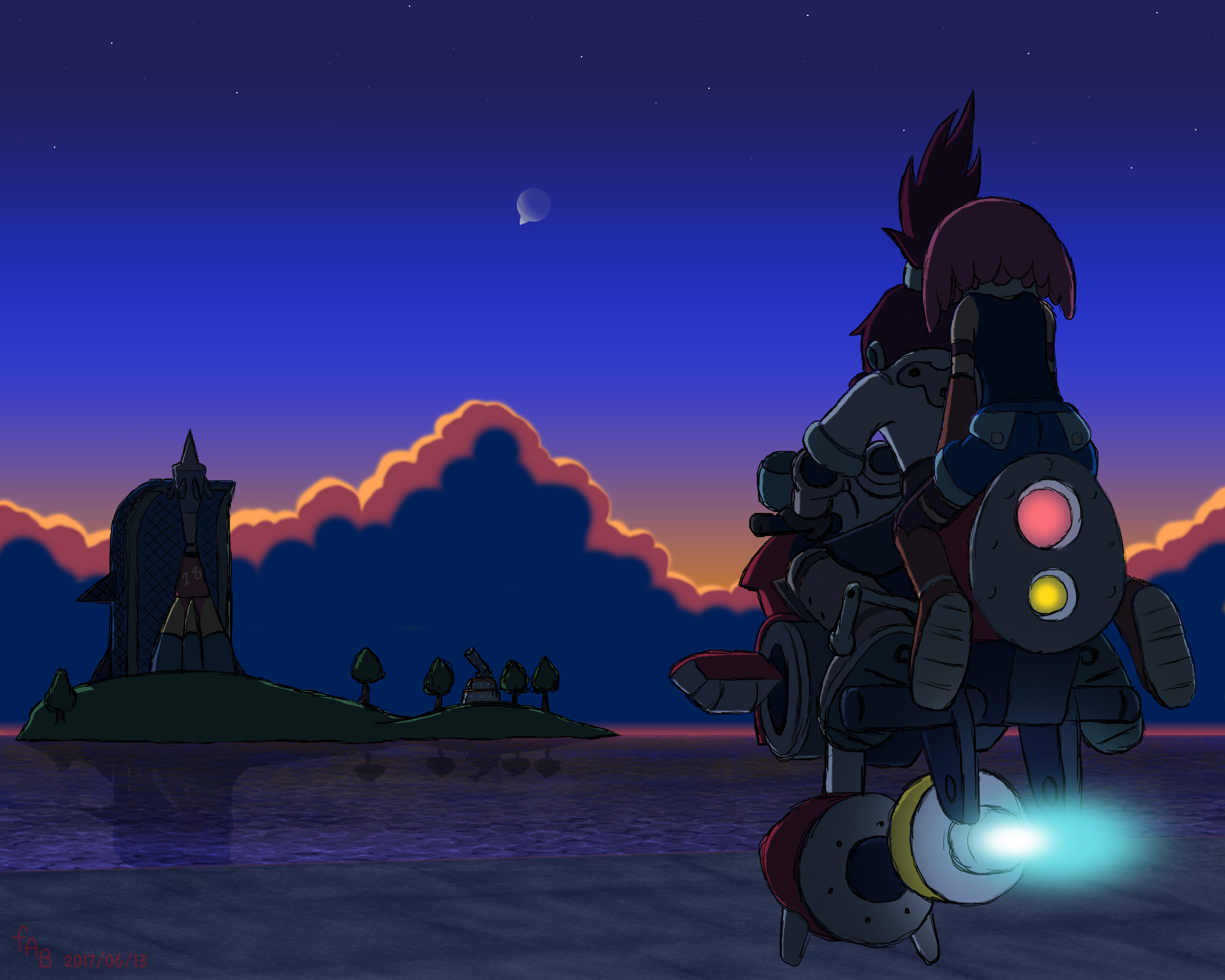 Earlier versions of my website, Mega Man Legends Station, featured self-made artwork on each game's index page. This is the image I did for Mega Man Legends 3. I didn't spend as long on it as on the other three games, and intentionally so, in the hopes that someday I'd be able to pour myself fully into depicting a scene from the finished game. Which never came, of course. I think this scene with its fading light and unlaunched rocket, successfully captures the mood that surrounds this title.