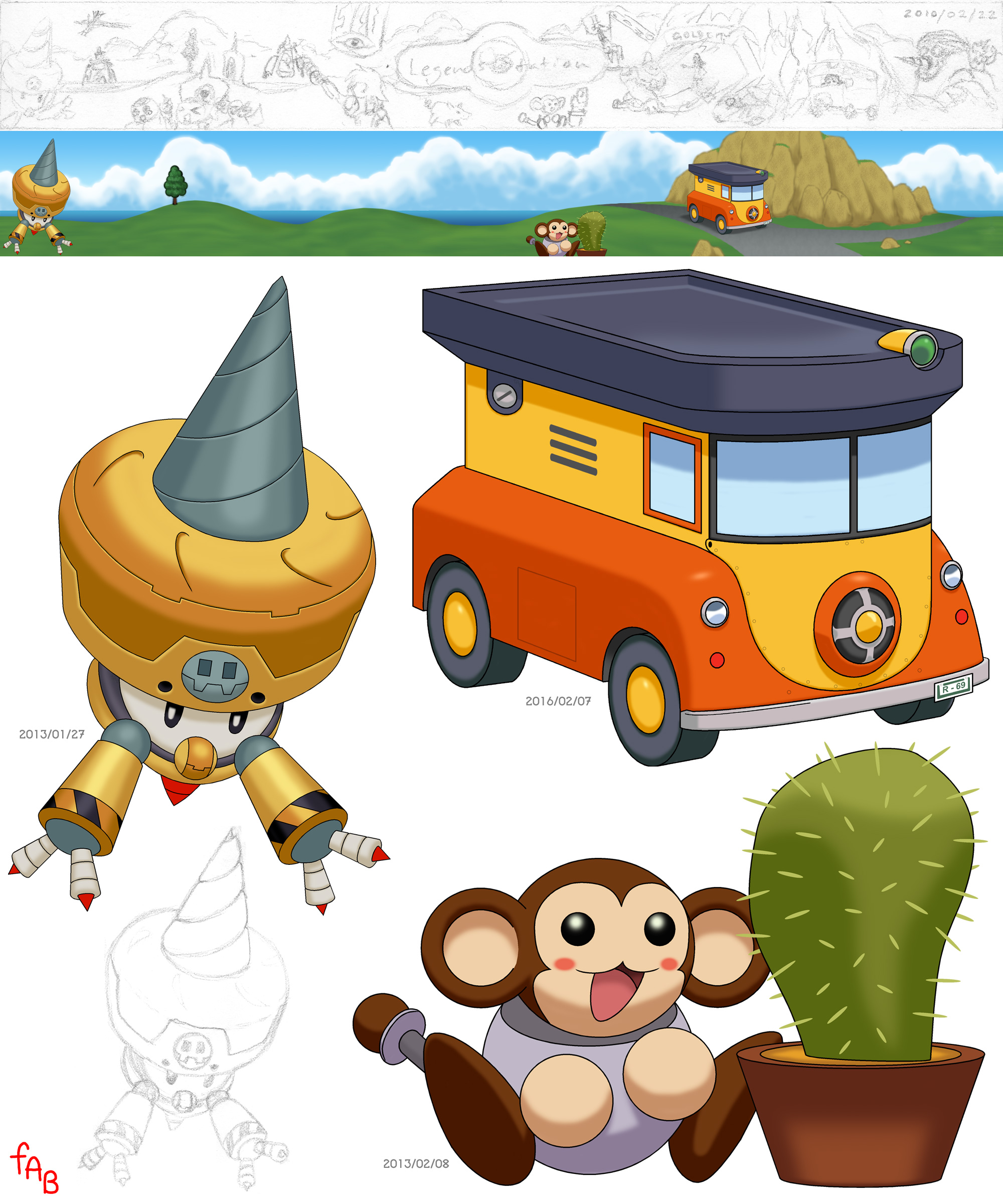 For the banner along the top of my website, Mega Man Legends Station, I wanted to draw an overworld landscape packed with Legends imagery. At the top of the image, you can see a rough sketch idea of what I had in mind. However, due to time constraints, the image originally went live with only an empty landscape. I intended to add elements one by one, but that was an extremely busy era in my life, and I only got so far. MMLS has since been revamped and doesn't use this banner anymore, so I'm glad to have it here on The Main Gate, and it gives me the chance to share nice large versions of the individual elements that had been tiny on the banner.