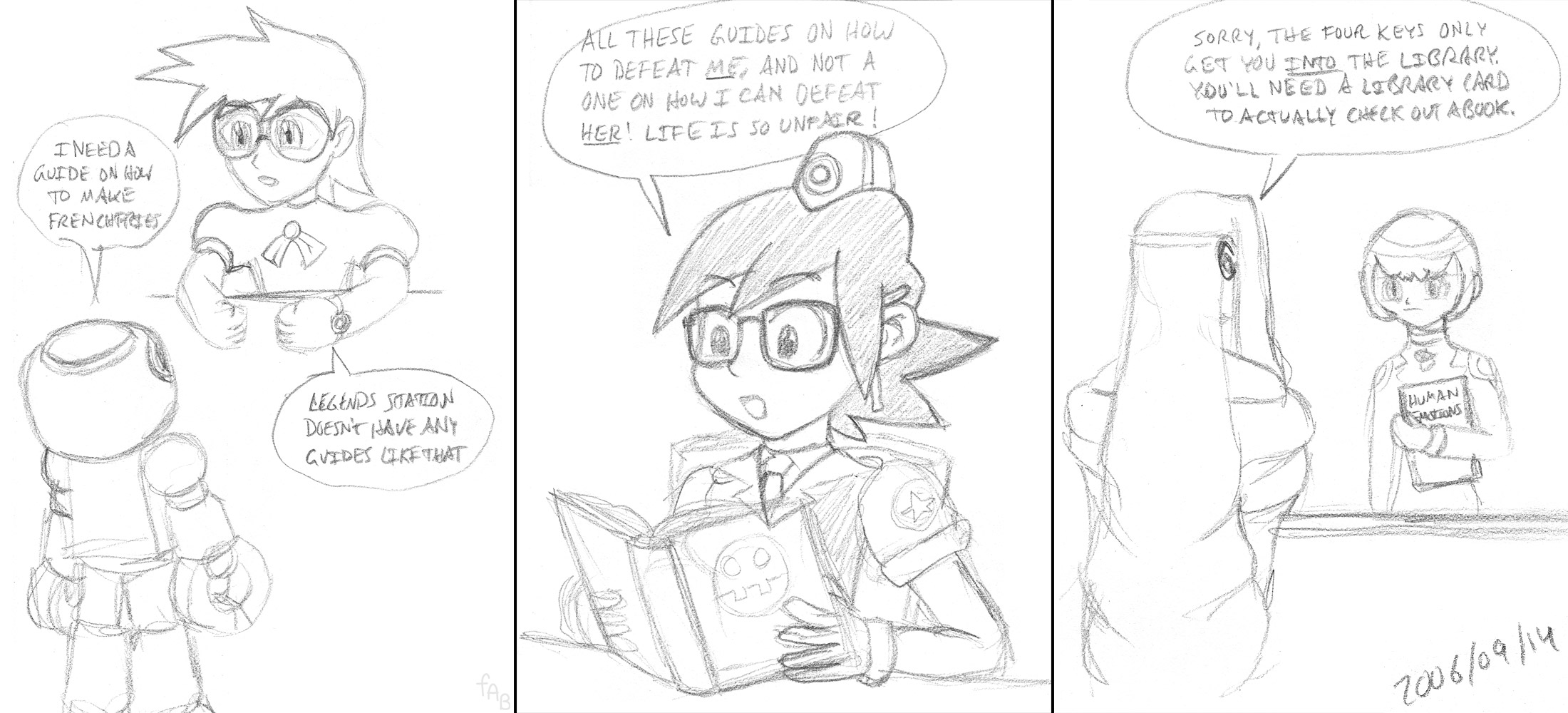 The guides section on my site, Mega Man Legends Station, were basically mere text link lists leading to resources. I thought some custom artwork would spice them up a bit, and sketched up these ideas, one for each of the main game titles. These were themselves guides, the magnificent final versions done by a friend from the forums, Emeltee.