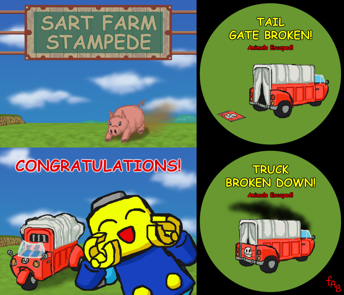 Hand-drawn assets for the title, ending, and game over screens of Sart Farm Stampede, a fun little game you can download from Sky Pirate Arcade.